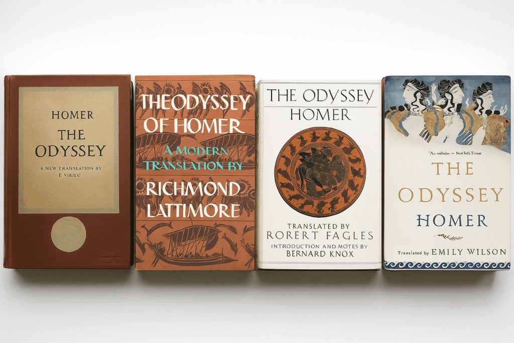 E. V. Rieu (Penguin Classics, 1946); Richmond Lattimore (Harper & Row, 1965); Robert Fagles (Viking Books, 1996); Emily Wilson (W. W. Norton, 2017).